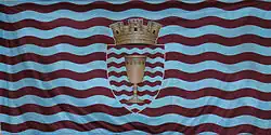 Wappen – ein faszinierendes Feld in gewelltem Burgunderrot, Kirschrot und Silber im Wechsel, eine Tasse goldenen Weins. Schild gestempelt mit einer goldenen Krone mit drei Türmen.