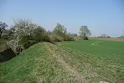 - Der landseitige Damm, der den Gemarkungsteil Busch mit seinem wertvollen Ackerboden schützt, ist höher gelegen und auf einem Grasweg begehbar. Er sollte jedoch als natursensibler Bereich in der Brutzeit und als Unterstand für Rehe gemieden werden. – Die Dammdurchfahrt wird bei Hochwasser geschlossen, indem man starke Bretter zwischen die seitlichen Aussparungen schiebt und den Zwischenraum verfüllt.
