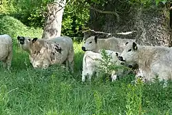 Zwischen dem Krappenweg und der Blauen Hütte grast friedlich für längere Zeit eine hoch prämierte Herde Galloway-Rinder. Die Gimbsheimer Beny und Gugumus züchten innerhalb dieser Rasse White Galloways mit weißem Fell, schwarzen Ohren und einem schwarzen Maul. Diese schöne Zeichnung erfreut alle vorbeikommenden Wanderer und Radfahrer.