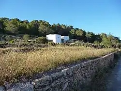 Im 14. Jahrhundert wurde der erst im Jahr 1782 zur Kathedrale erhobene Kirchbau vollendet.[17] Er steht auf dem höchsten Punkt der denkmalgeschützten Altstadt (Dalt Vila) und ist umgeben von der bereits in der zweiten Hälfte des 16. Jahrhunderts entstandenen Renaissance-Festung.[18] Bereits in den 1930er Jahren kamen einige Intellektuelle wie Walter Benjamin, Wols, Raoul Hausmann, Walter Gropius oder Le Corbusier nach Ibiza. Alle erkannten das Besondere an der meist nur eingeschossigen Bauweise der alten Bauernhäuser auf der Insel und berichteten darüber.[19] Die aneinander gesetzten Kuben dieser Landhäuser inspirierten auch die Bauhaus-Architektur. Auffallend sind neben den bis fast ein Meter dicken Steinmauern, die Anordnung der Räume. Fast immer ist der Eingang nach Süden ausgerichtet. Man betritt die Finca Ibicenca über eine Art Veranda (porxo), von der es zur einen Seite in die Küche geht. An diese angebaut ist ein Brotbackofen, in der Nähe eine Zisterne für Trinkwasser. An die Küche schließt sich noch der Vorratsraum an. Vom Porxo gehen verschiedene Schlafräume ab. Die Häuser haben ausschließlich Flachdächer, um das Regenwasser aufzufangen, welches in Zisternen gesammelt wird. Die Fenster sind sehr klein, so sind die Räume im Sommer kühl. Der deutsche Emigrant Erwin Broner, der lange Jahre auf Ibiza lebte, hat sich ausgiebig mit der Inselarchitektur befasst und einige alte Bauernhäuser modernisiert. In späteren Jahren hat der Kanadier Rolph Blakstad die Inselarchitektur genau studiert und im Neo-Ibizenkischen Stil gebaut. Der in Ibiza lebende belgische Architekt Philippe Rotthier hat die ausführlichste Publikation zur Architektur der Landhäuser Ibizas verfasst.[20][21]
