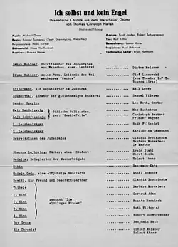 Jakob Rubiner: Günter Meisner; Bluma Rubiner: Cipé Lincovski; Silbermann: Emil Leser; Blumenthal: Samuel Fiderer; Cantor Szapiro: Leo Roth, Cantor; Meir Mandelzweig: Max Buchsbaum; Lajb Goldfiszlajn: Christoph Bantzer / Frieder Wagner; 1. Leichenträger: Ruth Filippini; 2. Leichenträger: Karl-Heinz Gassmann; Sekretärinnen des Judenrates: Claudia Brodzinska, Barbara Mawiecz, Iv Marker; Shachna Lajbovicz: Armin Stahl / Horst Siede; Gedalia: Helmut Ahner; Ektkin: Benjamin Katz; Meisje Grün: Ethel Reschke; Dovidl: Claudia Brodzinska; Taibele: Barbara Morawiecsz; 1. Kind: Gertrud Adam; 2. Kind: Renate Rennhack; 3. Kind: Ruth Filippini, 4. Kind: Robert Schwersenzer; Der Graue: Benjamin Katz; Ein Chronist: Günter Meisner / Helmut Ahner.[7]
