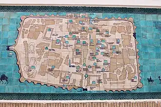 | Schematische Darstellung des Grundrisses von Ichan Qalʼа auf Kacheln. (Norden liegt links) | |