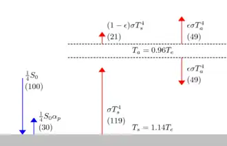 Im Gleichgewicht stellen sich Werte für Ts und Ta ein, so dass die von der Oberseite der Atmosphäre abgegebene Strahlungsleistung gleich der von der Atmosphäre absorbierten Strahlungsleistung ist. Das ankommende Sonnenlicht ist kurzwellig und die vom Planeten abgegebene Strahlung langwellig. Beide Strahlungsströme haben eigene, unterschiedliche Emissions- und Absorptionscharakteristiken.