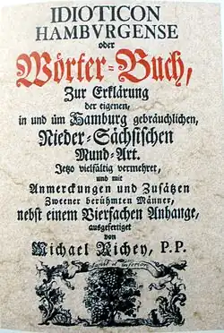 Das Idioticon Hamburgense von Michael Richey aus dem Jahr 1743 ist das erste Mundartwörterbuch des hamburgischen Dialekts. Der vollständige Titel lautet: Idioticon hamburgense sive glossarium vocum saxonicarum quae populari nostra dialecto Hamburgi maxime frequantatur; in der 2. Auflage von 1755: Idioticon Hamburgense oder Wörter-Buch, zur Erklärung der eigenen, in und üm Hamburg gebräuchlichen, Nieder-Sächsischen Mund-Art. Jetzo vielfältig vermehret, und mit Anmerckungen und Zusätzen zweener berühmter Männer, nebst einem Vierfachen Anhange, ausgefertiget. Der Hamburger Gelehrte Richey sammelte in jahrelangen Studien „typisch hamburgische Begriffe und Redewendungen aus dem Mund des Volkes“.[1] Auf Anregung Gottfried Wilhelm Leibniz’ veröffentlichte er diese Sammlung als eine Art Lexikon, in dem er den Sinn und Hintergrund der Ausdrücke beschrieb oder sie in die hochdeutsche Sprache übersetzte. 1755 brachte er eine erweiterte zweite Auflage heraus.