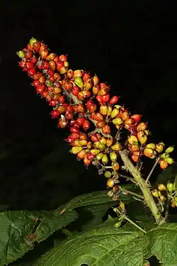 Fruchtstand mit reifenden, sich rot färbenden Steinfrüchten
