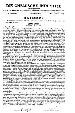 - Nachrufs auf Ignatz Stroof in »Die chemische Industrie« 43.1920, S. 495–497 Digitalisat des Nachrufs auf Commons