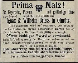 Den Inhabern Ignaz und Wilhelm Briess wurde der k.u.k. Hoflieferantentitel als Hof-Malz-Fabrikanten verliehen.[2]