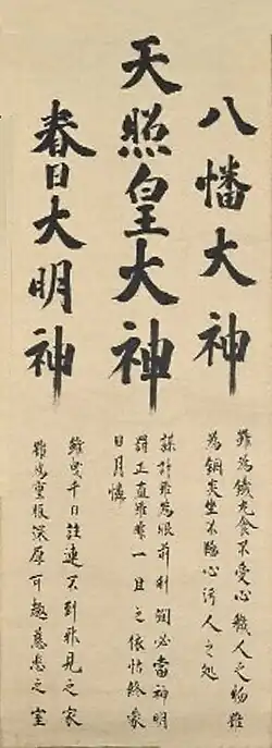 - ↑ Aufgelistet sind als „Drei Schreine Orakel“ (三社託宣, Sansha Takusen) die Shintō-Heiligen: Kasuga-Daimyō-jin (春日大明神), Amaterasu Ōmikami (天照大神) und Hachiman-jin (八幡神).
