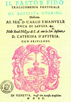 - IL PASTOR FIDO. TRAGICOMEDIA PASTORALE DI BATTISTA GVARINI, Dedicata AL SER[ENISSI]MO D[ON] CARLO EMANVELE DVCA DI SAVOIA. &c. Nelle Reali Notze di S[ua] A[ltezza] con la Ser[enissima] Infante D[ONNA] CATERINA D’AVSTRIA. CON PRIVILEGI. IN VENETIA, Presso Gio[vanni] Battista Bonfadino. MDXC. (Digitalisat)