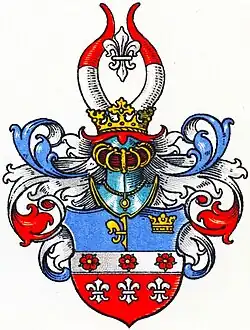 Blasonierung: Schild durch einen silbernen mit drei roten Rosen belegten Balken geteilt, oben in Blau die rechte Hälfte einer gespalteten goldenen Lilie, im linken (auch rechten) Oberwinkel eine goldene Krone. Unten in Rot drei silberne Lilien balkenweise gestellt. Auf dem gekrönten Helm mit blau-rot-silbernen Helmdecken eine silberne Lilie zwischen zwei von Rot und Silber geteilten Büffelhörnern.[1]