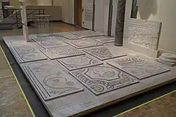 Die Basilika hatte einen Mosaikfußboden von sehr hoher Qualität. Die Darstellungen bestanden zum Teil aus römischen Motiven wie zum Beispiel Guilloche, Rosetten, Efeu, Fische und Vögel und aus dem christlichen Repertoire wie Weinblätter mit Trauben, Lorbeerblätter, Kreuze, geometrische Muster und Pflanzen. Das Farbspektrum der Mosaiksteine war sehr groß: weiß, schwarz, tiefrot, orange, grau, blassrosa, braun, gelb, pink, blau und grün. Die Mosaiken und Architekturfragmente aus Marmor sind heute im Byzantinischen und Christlichen Museum in Athen ausgestellt.