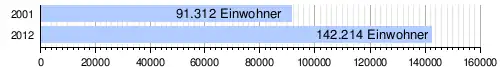 Im Stadtgebiet ohne den ländlichen Siedlungen lebten bei der Volkszählung 2012 22.491 Einwohner in 3740 Haushalten,[2] bei der Volkszählung 2001 15.805 in 2705 Haushalten[14] und bei der Volkszählung 1988 11.707 in 2043 Haushalten.[15] Bei der Volkszählung 1977 waren es 8299 Einwohner.[16]