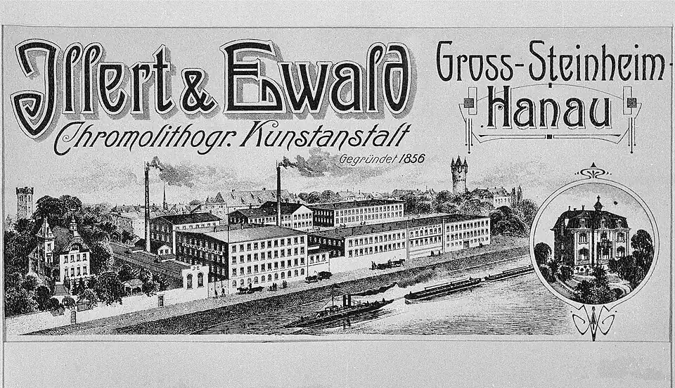 Die Hanauer Firma hat ihren Ursprung im Jahr 1856, als der aus Mühlheim am Main stammende Lithograf Heinrich Konrad Johann Philipp Illert (1827–1898)[2] mitsamt seiner Familie und seiner Druckerei nach Steinheim übersiedelte.[3] Am Standort in der Mainstraße druckte er anfangs vor allem Etiketten für die lokale Tabakindustrie,[2] stattete Zigarrenkisten und Zigarrenbanderolen aus.[1] Nach nur einem Jahr nahm Illert den Kaufmann Ewald in sein Unternehmen auf, das dann „Lithographische Kunstanstalt Illert & Ewald“ firmierte. Wurden die Drucke anfangs noch per Handarbeit hergestellt, wurde bald darauf die Chromolithografie für den mehrfarbigen eingeführt.[2] und 1878[1] oder 1880 die erste Dampfmaschine in Betrieb genommen.[2]