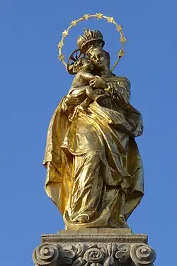 Ilz, Hauptplatz mit Mariensäule Pfarrhof und Pfarrkirche im Hintergrund