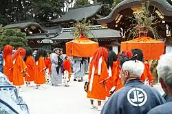 994 wurde der Schrein in eine Mikoshi verlegt, einem tragbaren Shintō-Schrein (bzw. Sänfte), in dem die Kami mittels eingelagerten Shintai („Gottkörper“) reisen.