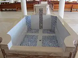 Das dreischiffige Kirchengebäude ist verhältnismäßig schlicht gehalten. Die Mauern bestehen aus bräunlich-grauem Lavagestein. Das Innere ist cremefarben gehalten, die Dachuntersicht ist in hellblau gehalten. Das Kruzifix vor der unverputzten Stirnwand im Chor bestimmt die Kirche. Eine Besonderheit ist ein begehbares Taufbecken.