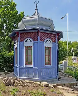 Im Vorgarten befindet sich ein achteckiger, hölzerner Gartenpavillon mit Pagodendach aus Metall, der im maurischen Stil gestaltet wurde.[1]
