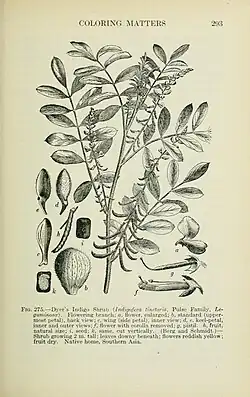 Die Kultivierung des Indigostrauchs stammt aus den Herkunftsländern Indiens und Ostasiens und ist bereits 2500 v. Chr. in Ägypten nachweisbar. Plinius beschreibt die Herkunft aus Indien. Der Farbstoff komme im Schaum der Flüsse vor und werde an einer bestimmten Schilfart abgelagert, von dem ihn die Einheimischen absammelten. In Europa war Indigo bis zum 12. Jahrhundert selten, er wurde in kleinen Mengen über Syrien und Alexandria aus Indien importiert.[5] Um 1420 wird er in einer venezianischen Frachtliste aufgeführt. Ab ca. 1600 wurde er in großen Mengen von den Niederländern aus Ostindien eingeführt und verdrängte den bis dahin zum Färben von Textilien gebrauchten Färberwaid.[5]