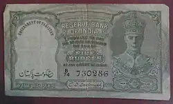 Die ersten Banknoten mit dem Porträt Königin Victorias emittierte das Government of India 1861. Zwischen 1872 und 1927 blieb das Design der Scheine, nun ohne Porträt, praktisch unverändert. 1917 begann die Ausgabe von Scheinen mit dem Bild Georg V. Etwa ein Viertel der Ausgabe solcher Ein-R.-Scheine wurde in Heftchen zu 25 in Verkehr gebracht. Seit 1937 liegt das Notenprivileg bei der Reserve Bank of India. Allerdings wurden Ein-R.-Scheine ab 1940 wieder von der Regierung ausgegeben.