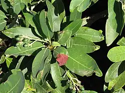 Die kleinen, ellipsoiden bis eiförmigen und einsamigen Beeren mit Perianthresten und Blütenbecher sind bis ungefähr 2 Zentimeter groß, olivenförmig, leicht fleischig, leicht „bereift“ und färben sich zur Reifezeit blauschwarz.[2]
