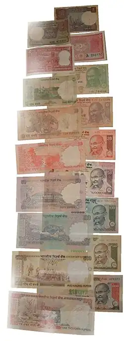 Die heutigen indischen Münzen haben einen Nennwert von 5, 10, 20, 25 und 50 Paise und außerdem von 1, 2, 5, 10 und 20 Rupien. Die 5-, 10-, 20- und 25-Paise-Münzen wurden 2011 ungültig. Die 50-Paise-Münze ist zwar noch legales Zahlungsmittel, allerdings eher selten in Gebrauch. Die Banknoten sind erhältlich mit Nennwert von 5, 10, 20, 50, 100, 200, 500 und 1000 Rupien, seit dem 10. November 2016 zusätzlich auch die Ausgabe eines 2000-Rupien-Scheins, gleichzeitig wurde aber der 1000 Rs-Schein ungültig. Der 2000-Rupien-Schein wurde 2023 ungültig. Scheine mit Nennwert von 1 und 2 Rupien werden auch emittiert, aber nur in geringer Zahl und sind daher sehr selten erhältlich.[1][2] In Indien ist kontaktlose Zahlung mittels der App Paytm weit verbreitet. Auf den Rupien-Scheinen wird auch die indischen Sprachen- und Schriftenvielfalt berücksichtigt. Auf den aktuellen Banknoten ist der Nominalwert in den wichtigsten 17 indischen Sprachen aufgedruckt.[3][4]
