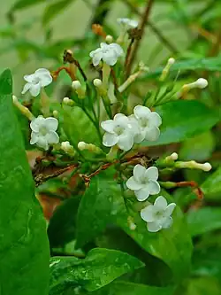 Sie bildet zwischen (Februar) April und Mai (Oktober) viele kleine, zwittrige, radiärsymmetrische, und fünfzählige, stieltellerförmige, dickgestielte Blüten aus. Sie stehen in achsel- oder endständigen, lang gestielten und zymösen Blütenständen. Die becherförmig verwachsenen, kleinen Kelchblätter mit dreieckigen Zipfeln, sind anfangs grünlich, dann weißlich, rötlich und dann nach der Befruchtung rötlich. Nachdem die Krone abgefallen ist, wird der Kelch und der Blütenstiel rot und die Kelchzipfel schließen sich. Die Kronblätter sind zu einer etwa 1,2–1,7 Zentimeter langen, weiß-rosa Kronröhre, mit einem oberhalb der Mitte kurzen, verdickten Teil und weißen, kurzen Kronzipfeln verwachsen. Die dachziegeligen Kronzipfel überlappen nach links. Es ist nur ein Staubblattkreis vorhanden; die Staubfäden sind sehr kurz und in der Kronröhre so angeordnet, dass die Staubbeutel im verdickten Teil liegen. Die zwei genäherten bis kurz verwachsenen Fruchtblätter sind oberständig mit einem langen Griffel, der etwa bei den Antheren endet, mit einem breiten, zylindrischen, oben fransigen Narbenkopf mit zwei kleinen Spitzen, und unten einem Anhängsel. Es ist ein becherförmiger Diskus vorhanden.