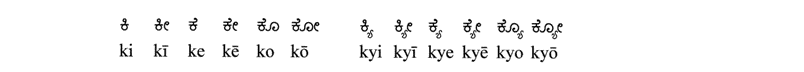 | ē | eː | ए | के | এ | কে | ਏ | ਕੇ | એ | કે | ଏ | କେ | ஏ | கே | ఏ | కే | ಏ | ಕೇ | ഏ | കേ | ඒ | කේ | ཨེ | ཀེ |