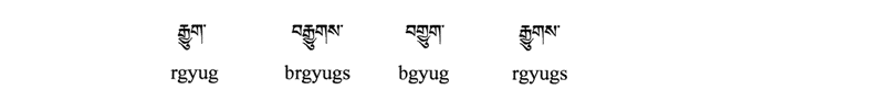 Die Tibetische Orthographie ist extrem historisch. Sie gibt den Sprachstand von vor mehr als 1000 Jahren wieder. So werden bezogen auf die moderne Sprache große Mengen „überflüssiger“ Buchstaben mitgeschleppt, die aus längst aus der Sprache verschwundenen Morphemen stammen. Die folgenden vier Wörter werden alle [ɡʲuɡ] ausgesprochen! Es sind die Stammformen des Verbs „laufen“.