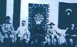 Mahendra Pratap (Mitte), während der Mission nach Kabul, 1915. Rechts neben ihm sitzt Werner Otto von Hentig.