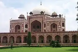 Wegbereiter des mogulischen Grabmalstils war das Mausoleum des Mogulkaisers Humayun in Delhi, das 1571 als erstes monumentales Grabmal und als erster Monumentalbau der Mogulzeit überhaupt fertiggestellt wurde. Es besteht aus einem achteckigen, überkuppelten Mittelraum, dem vier in die Himmelsrichtungen weisende Pishtaqs mit je zwei Chattris vorgelagert sind. Die Kuppel ist als erste auf dem indischen Subkontinent doppelschalig ausgeführt, d. h., es wurden zwei Kuppeldächer übereinander gesetzt, so dass die innere Raumdecke nicht mit der Wölbung der Außenkuppel übereinstimmt. Spätere Baumeister machten sich diese Bauform zunutze, um die äußere Scheinkuppel immer stärker zwiebelförmig auszuwölben.[18] Vier identische, achteckige Eckbauten mit je einem großen chattri auf dem Dach füllen die Nischen zwischen den Pishtaqs, sodass der gesamte Baukörper äußerlich als Quadratbau mit abgeschrägten Ecken und eingerückten Pishtaqs erscheint. Das eigentliche Mausoleum erhebt sich auf einem stockwerkhohen, terrassenartigen Sockel, in dessen Außenwände zahlreiche iwane eingelassen wurden. Humayuns Grabmal vereint aus der einheimischen Bautradition übernommene und persische Elemente in sich, wobei letztere deutlich überwiegen, da nicht nur der Architekt aus Persien stammte, sondern im Gegensatz zu vielen früheren Bauvorhaben auch ein großer Teil der beim Bau eingesetzten Handwerker ausländischer Herkunft war.[19] So sind indische Architrave, Konsolen und plastische Verzierungen vollständig zu Gunsten von Kielbögen und flächigem Fassadenschmuck zurückgedrängt. Die persische Vorliebe für symmetrische Formen spiegelt sich sowohl im Grabmal als auch in der dieses umgebenden, ummauerten Gartenanlage wider. Letztere entspricht dem Typus des Char Bagh mit quadratischem Grundriss und vier Fußwegen, die ein Achsenkreuz bilden und den Garten somit in vier kleinere Quadrate unterteilen.