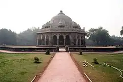 Auch in Delhi setzte sich der achteckige Grundriss in der zweiten Hälfte des 14. Jahrhunderts durch, wie am Grab des Ministers Khan-i-Jahan aus der Zeit Firuz Shahs zu sehen ist. Dies ist möglicherweise so, weil das dem Kreis angenäherte Achteck als Grundlage des Unterbaus bessere statische Eigenschaften beim Bau einer Kuppel mit sich bringt als das Quadrat, welches kompliziertere Trompenlösungen erfordert.[17] Unter der Sayyid-Dynastie etablierte sich in der ersten Hälfte des 15. Jahrhunderts ein Typus, der neben dem achteckigen Grundriss durch eine bisweilen mittels eines Tambours erhöhte Kuppel sowie durch einen umstehenden Arkadengang mit Konsoldach gekennzeichnet ist. Diesen Typus vertritt das Mausoleum Muhammad Shahs in Delhi, dessen Kuppelabschluss in der Form eines Lotos und Zierpavillons (Chattris) auf dem Arkadendach bereits einige Merkmale späterer mogulischer Moscheen und Grabmäler vorwegnimmt. Ihm folgen in der ersten Hälfte des 16. Jahrhunderts die sehr ähnlichen Gräber Isa Khans in Delhi und Sher Shahs in Sasaram (Bihar, Nordostindien) nach.