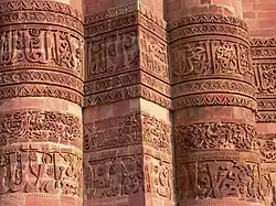 Unter den Sultanen der Sklavendynastie (1206 bis 1290) kamen in großem Umfang Spolien zerstörter hinduistischer und jainistischer Tempel im Moscheenbau zum Einsatz. Dennoch überließen die islamischen Eroberer einheimischen Hindu-Baumeistern die Ausführung ihrer Bauvorhaben, da indische Steinmetzen über wesentlich größere Erfahrung im Umgang mit Haustein als Baumaterial verfügten als die an Ziegelbauten gewöhnten Architekten ihrer Heimat.[9] Obwohl jeglicher Figurenschmuck an den verwendeten Spolien entfernt und durch abstrakte Muster oder Koranverse ersetzt wurde, zeigt der Fassadendekor der Moscheen in seinem Detailreichtum, wie er von zeitgenössischen vorderasiatischen Bauten unbekannt ist, von Anfang an unübersehbaren indischen Einfluss.