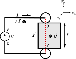 - ↑ Bei der Bildung der zeitlichen Ableitung des magnetischen Flusses ist darauf zu achten, dass sich der Flächenrand (d. h. die Umlaufkurve) überall nach Maßgabe der konvektiven Randelemente verschiebt.
