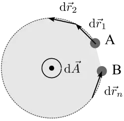 der durch eine (beliebige) von der Leiterschleife, den Zuleitungen zum Messgerät und den Leitungen im Messgerät begrenzte Fläche hindurchtritt. Bei der Berechnung des Flusses kommt es nicht auf die Form der Fläche, sondern ausschließlich auf deren Berandung an. Ebenso ist es bei der Rechnung nicht notwendig zu unterscheiden, ob die elektrische Spannung der Anordnung durch eine Änderung der Flussdichte oder durch eine Bewegung des Leiters erzeugt wird.