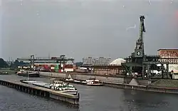 - Der Industriepark Höchst verfügt über einen eigenen Binnenhafen. Am nördlichen Ufer befinden sich sechs Steiger zur Abfertigung von Tankschiffen. Zwischen mittlerer Werksbrücke und Leunabrücke erstreckt sich eine mehrere hundert Meter lange Kaimauer, an der ebenfalls Schiffe anlegen können. Hier wird hauptsächlich Kraftwerkskohle gelöscht. Auf der Südseite gibt es ein 450 Meter langes Hafenbecken, in dem mehrere Schiffe gleichzeitig liegen können. Es dient hauptsächlich der Anlieferung von Steinsalz sowie dem Containerumschlag für das Frankfurt Intermodal Terminal. Durch das Containerterminal werden die Verkehrsträger Wasser, Schiene und Straße „trimodal“ miteinander verknüpft. Der jährliche Güterumschlag liegt bei ca. 2 Millionen Tonnen, darunter 20000 Container.[1]