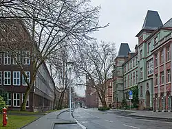 Das bekannteste Bauwerk des Werksgeländes ist das 1920 bis 1924 errichtete Technische Verwaltungsgebäude, nach seinem Architekten Peter Behrens auch als Behrensbau bezeichnet. Turm und Brücke des Bauwerks waren von 1947 bis 1997 das Firmenlogo der Hoechst AG.