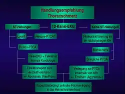 Ein möglicher Ablauf ist, dass der Notarzt anhand der Symptome und des EKGs ein ACS diagnostiziert, mittels Telemetrie ein 12-Kanal-EKG an das nächste kardiologische Zentrum mit Notfall-PTCA-Bereitschaft übermittelt wird, der diensthabende Kardiologe der Klinik das EKG beurteilt und im gegebenen Fall dem Notarzt die Gabe eines GP-IIb-IIIa-Antagonisten (Abciximab) und weiterer Medikamente sowie den sofortigen Transport in die Klinik empfiehlt. Zeitgleich werden in der Klinik die Vorbereitungen für die PTCA getroffen, die der Infarktpatient bei Ankunft in der Klinik schnellstmöglich bekommt, wenn nötig unter laufender kardiopulmonaler Reanimation.