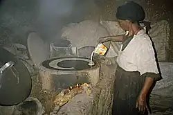 Die Teigmischung wird meist zwei bis drei Tage stehen gelassen, bis sich ein mild-sauerer Geschmack entwickelt. Der Teig enthält soviel Wasser, dass er sich auf die heiße Herdplatte gießen lässt.