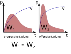 Der Energiegehalt der Treibladungen ist kaum von ihrem Abbrandverhalten abhängig. Bei gleicher Lauflänge und Pulverladung kann damit ein Geschoss von einem offensiven und einem progressiven Pulver auf die gleiche Geschwindigkeit gebracht werden. Das offensive Pulver erzeugt dabei einen höheren Gasdruck, der aber für einen kürzeren Zeitraum auf das Geschoss wirkt, so dass die verrichtete Arbeit idealisiert die gleiche ist.