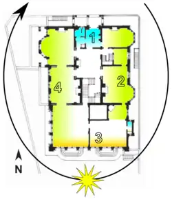 - Im Boden versenkte Lichtquellen können verwendet werden, um Wände, Decken, Soffitten und Ähnliches auszuleuchten. Je nachdem, wie dies gemacht ist, akzentuiert diese Technik entweder die Höhe und Vertikalität eines Raumes oder lässt ihn intimer wirken.[69]