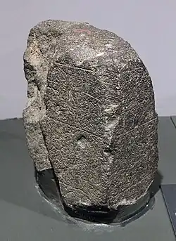 Das Stelenfragment ist aus Basalt und hat eine Höhe von 0,43 Metern. Die Breite der beiden geglätteten und beschrifteten Seiten beträgt jeweils etwa 0,23 Meter. Der Beginn der Inschrift wird in der (fehlenden) linken oberen Ecke der linken Seite vermutet. Die erste Zeile verläuft dann rechtsläufig über die Ecke zur anschließenden Seite, um dann boustrophedon in den folgenden Zeilen fortzulaufen. Die Oberseite des Fragments ist geglättet, weshalb als gesichert gelten kann, dass die obere Zeile den Anfang darstellte. Teile von Zeichen, die Charles in seiner Umzeichnung über der obersten Linie eingezeichnet hat, konnte Gelb „at least after careful study“ nicht entdecken.[3] Unter der zweiten Zeile sind dagegen noch deutlich Reste einer Fortsetzung des Textes zu erkennen.