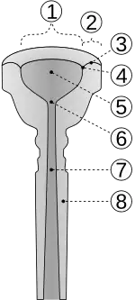 Die geometrische Innenform des Mundstücks ist grundlegend klangbeeinflussend. Die „U“-Kesselform erzeugt mehr Obertöne und der Klang wird „scharf“ und „hell“ wie bei der Trompete, eine „V“-Trichterform erzeugt weniger Obertöne und der Klang wird weich und dunkel wie bei dem Flügelhorn oder Waldhorn.