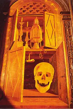 Intarsie im Chorgestühl von St. Martin in Memmingen, erbaut von 1501 bis 1507