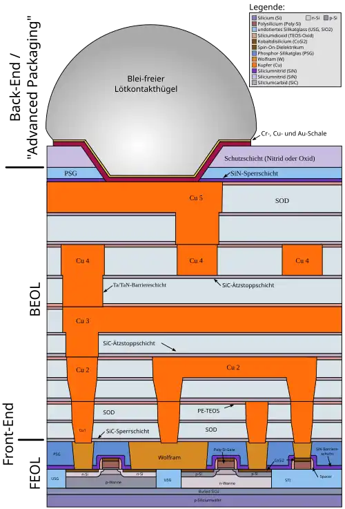 - Back-End-of-Line (engl. back-end of line, BEOL, dt. ‚hinteres Ende der Produktionslinie‘): Dieser Schritt umfasst im Wesentlichen die sogenannte Metallisierung, bei der die im FEOL gefertigten Bauelemente miteinander verbunden werden, und die abschließende Passivierung der Oberfläche.