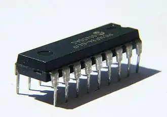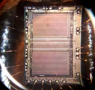 Integrierte Schaltkreise können heutzutage Schaltungen mit vielen Milliarden elektronischen Bauelementen (insbesondere Transistoren) umfassen, so dass auch hochkomplexe Schaltungen wie Mikroprozessoren und Speicherchips auf wenige Quadratmillimeter kleinen Halbleiterplättchen untergebracht werden können. Seit Anfang der 1990er Jahre werden die Mikrostrukturen dieser Elemente schon im Nanometer-Bereich gefertigt.[1] Die rechteckigen Halbleiterplättchen werden Chip genannt (auch schon im Rohzustand), insbesondere zusammen mit dem aufgebrachten elektronischen Schaltkreis auch Mikrochip. Die Herstellung von ICs erfolgt in eigenen Halbleiter-Fabriken in absolut staubfreien Reinräumen und umfasst eine Vielzahl von Prozessschritten physikalischer und chemischer Art. Da generell die Leistungsfähigkeit von Mikroprozessoren und Speicherchips mit kleiner werdenden Strukturen auf dem Chip zunimmt, bewegt sich deren Miniaturisierung oft an der Grenze des technisch und physikalisch Machbaren. Es existieren jedoch auch zahlreiche, insbesondere standardisierte ICs wie Logikbausteine und Operationsverstärker. Zunächst enthielten die Logik-Chips der weit verbreiteten, bereits seit den 1970ern hergestellten 74xx-Serie nur eine Anzahl Transistoren im ein- oder zweistelligen Bereich.