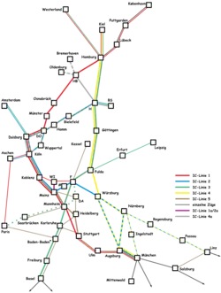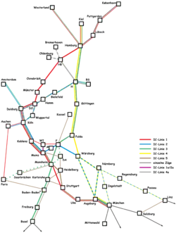 - Linie 1 (rot): Hamburg-Altona – Bremen – Münster – Dortmund – Essen – Duisburg – Düsseldorf – Köln – Bonn – Koblenz – Mainz – Mannheim – Heidelberg – Stuttgart – Ulm – Augsburg – München