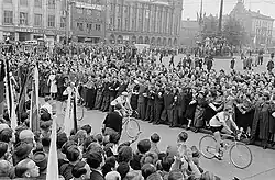 Fahrer, u. a. Gustav Adolf Schur (ganz rechts), beim Etappenstart auf dem Karl-Marx-Platz