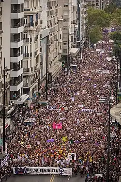 Die meisten großen Demonstrationen am Frauentag finden in Lateinamerika statt, wo vor allem gegen die hohe Zahl von Frauenmorden protestiert wird (siehe Femizid in Lateinamerika). In Santiago de Chile wurden 500.000 Teilnehmende erwartet, die Polizei spricht von 125.000, es kommt zu einigen gewaltsamen Zusammenstößen; Hauptforderung ist die Abschaffung des strikten Abtreibungsverbots.[28]