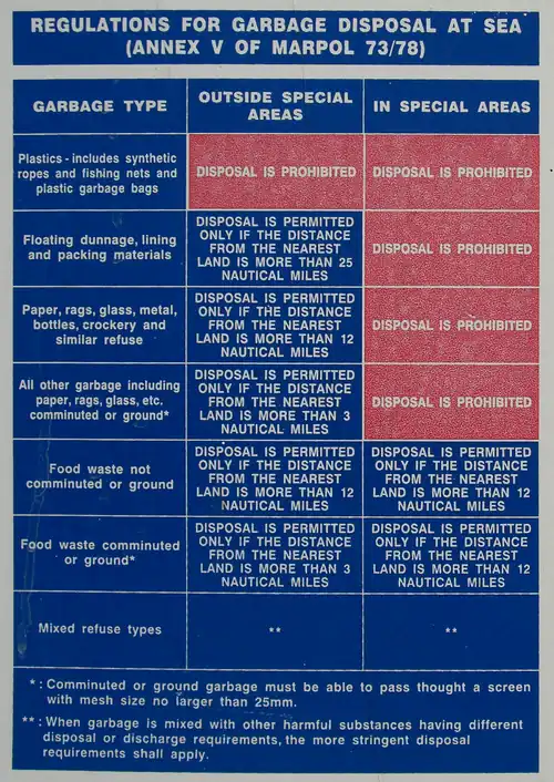 Sonstiger Müll, einschließlich Kunststoffen, synthetischer Seile, Fanggerät, Kunststoffmülltüten, Asche aus Verbrennungsanlagen, Schlacke, Speiseöl, treibendes Stauholz, Verkleidungs- und Verpackungsmaterial, Papier, Lumpen, Glas, Metall, Flaschen, Steingut und ähnliche Abfälle dürfen nicht ins Meer eingeleitet werden.