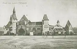Die mittelalterlich anmutende «Burganlage» in der sich das Friedensmuseum befand, wurde 1901 als Festhütte für das Eidgenössische Schützenfest in Luzern erbaut.[1] Dem Museum angeschlossen war der Verlag des Internationalen Kriegs- und Friedensmuseums. An diesem Standort befindet sich heute das Kultur- und Kongresszentrum Luzern (KKL).